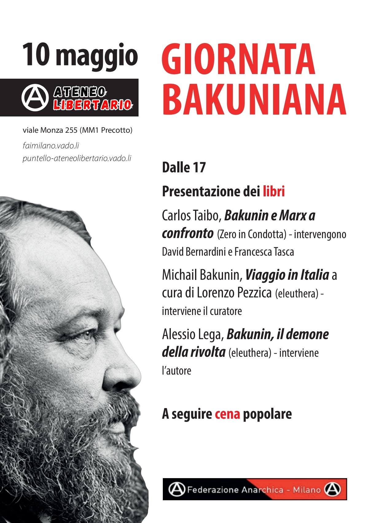 Nel centocinquantesimo della morte di Bakunin organizziamo le tre presentazioni, come da locandina, e una cena popolare a seguire.